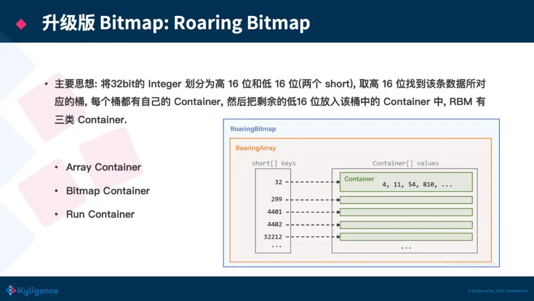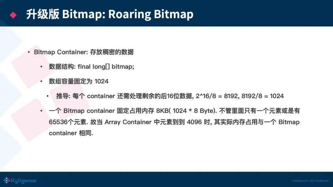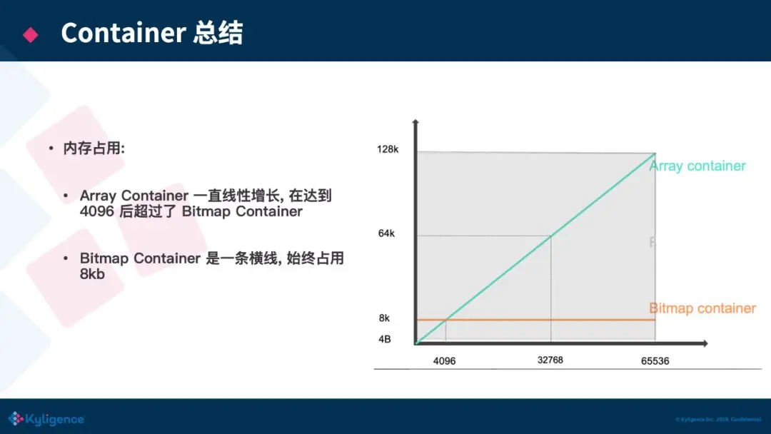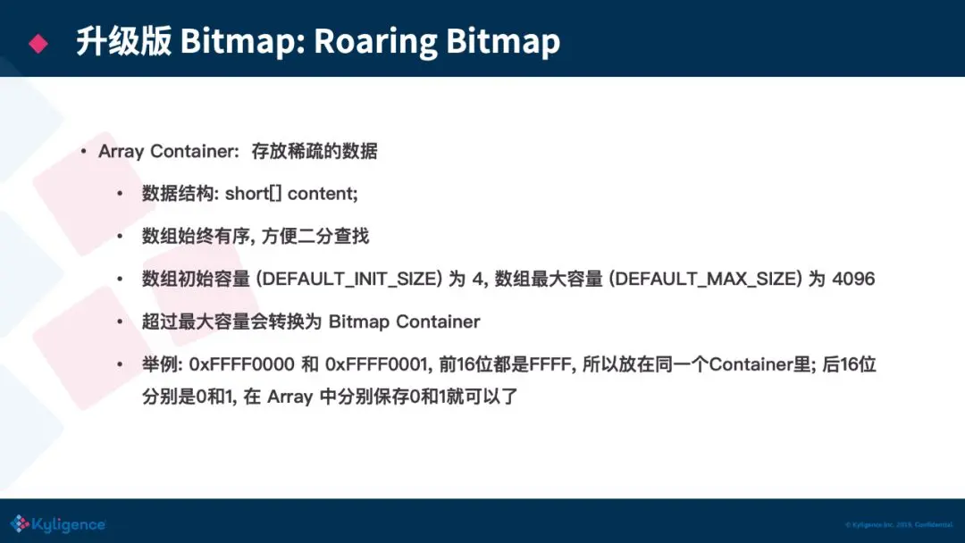 我们自己在 Kylin 中实践使用 Roaring Bitmap 时,我们发现 Array Container 随着数据量的增加会不停地 resize 自己的数组,而 Java 数组的 resize 其实非常消耗性能,因为它会不停地申请新的内存,同时老的内存在复制完成前也不会释放,导致内存占用变高,所以我们建议把 DEFAULT_MAX_SIZE 调得低一点,调成 1024 或者 2048,减少 ArrayContainer 后期 reszie 数组的次数和开销。