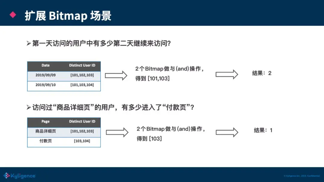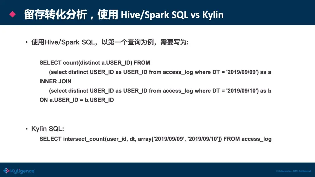 可以看到在其他 Query engine 中,计算用户的两天留存率,需要 join 两个子查询,并且有三个 count distinct 的Aggregate,可想而知这个性能不会太好,而 Kylin 只需要直接使用 intersect_count 函数就可以支持此类分析。