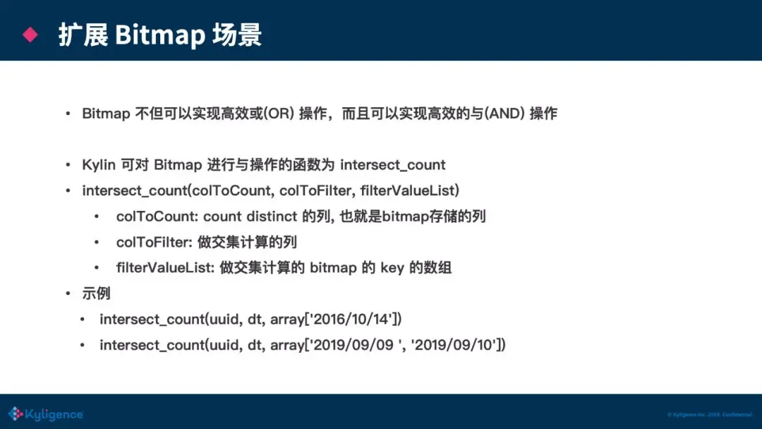为了便于在 SQL 中做“与”操作,Kylin 提供了一个自定义函数:“intersect_count”(详见Apache Kylin官方文档)。顾名思义这个函数就是求交集以后的结果数。