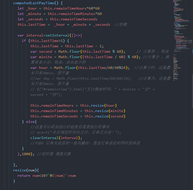 computedLastPayTime() { let _hour = this.remainTimeHours6060 let _minute = this.remainTimeMinutes*60 let _seconds = this.remainTimeSeconds this.lastTime = _hour + _minute + _seconds //秒数