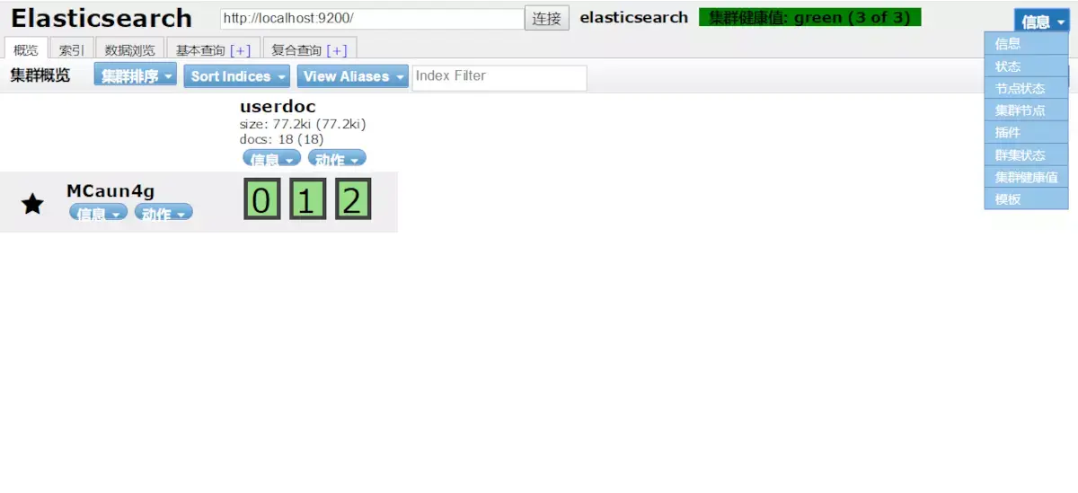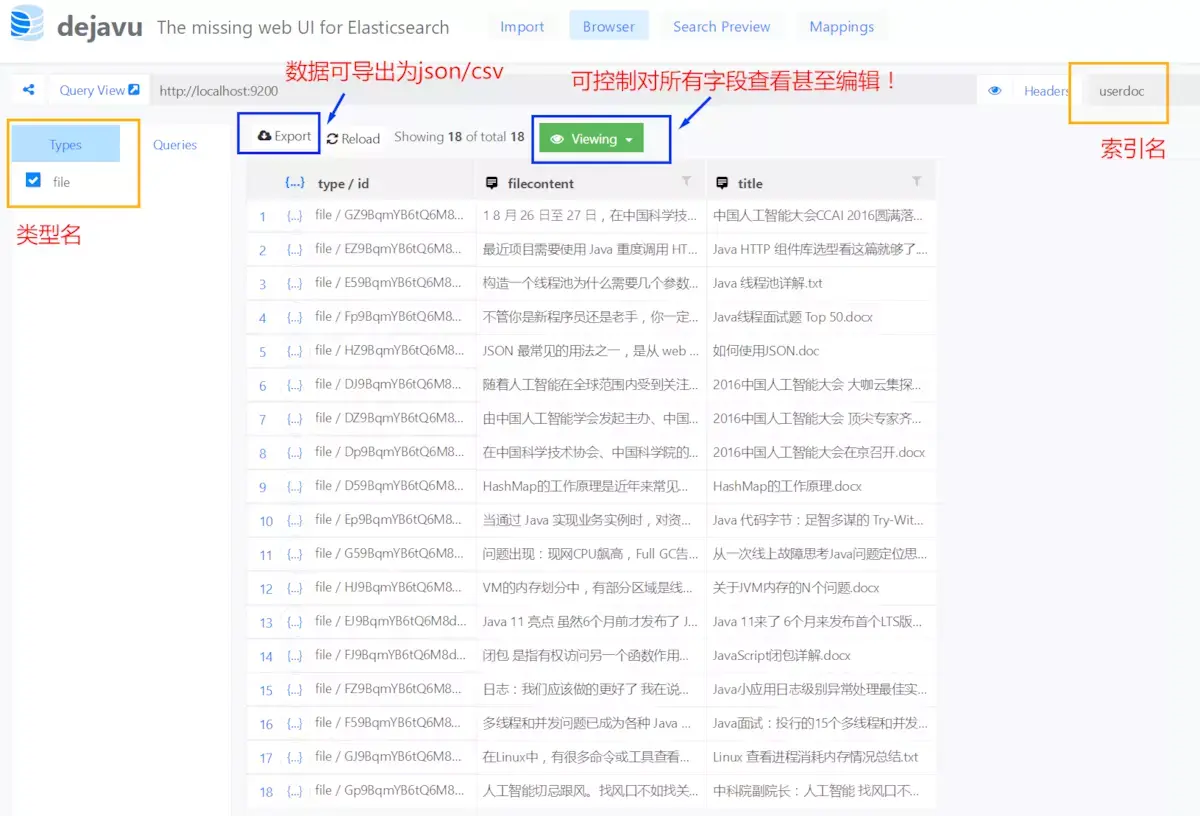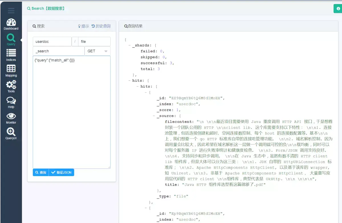 这个数据预览页面非常直观,索引/类型/文档 看得一清二楚