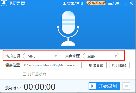 3、我们可以在这款软件的录音操作页面上,看到有关电脑录音的两个选项。一个是有关音频格式的“格式选项”,还有一个是有关电脑声音录制的“声音来源”。我们可以在这两个选项中设置电脑录音的选择