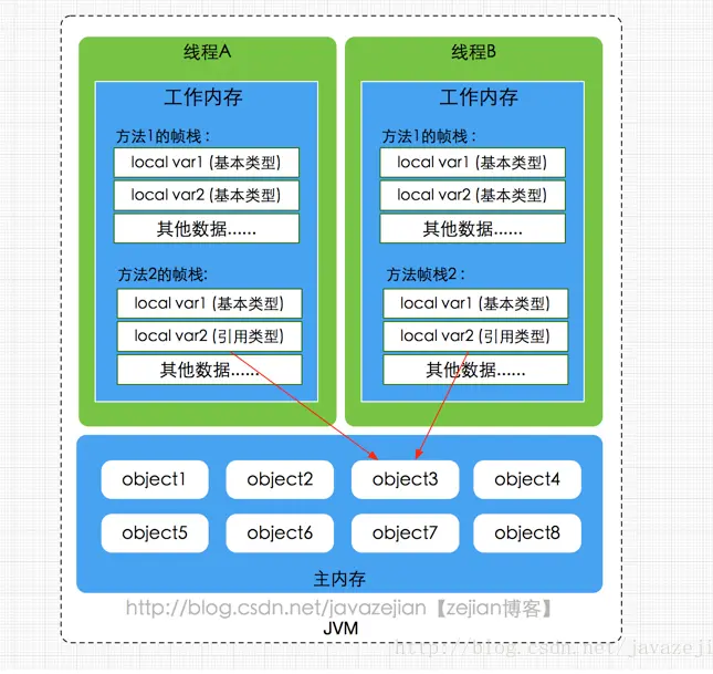 弄清楚主内存和工作内存后,接了解一下主内存与工作内存的数据存储类型以及操作方式,根据虚拟机规范,对于一个实例对象中的成员方法而言,如果方法中包含本地变量是基本数据类型(boolean,byte,short,char,int,long,float,double),将直接存储在工作内存的帧栈结构中,但倘若本地变量是引用类型,那么该变量的引用会存储在功能内存的帧栈中,而对象实例将存储在主内存(共享数据区域,堆)中。