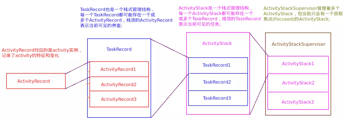 2、TaskRecord也是一个栈式管理结构,每一个TaskRecord都可能存在一个或多个ActivityRecord,栈顶的ActivityRecord表示当前可见的界面;