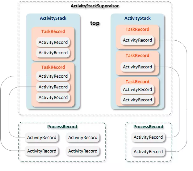 3、ActivityStack是一个栈式管理结构,每一个ActivityStack都可能存在一个或多个TaskRecord,栈顶的TaskRecord表示当前可见的任务;