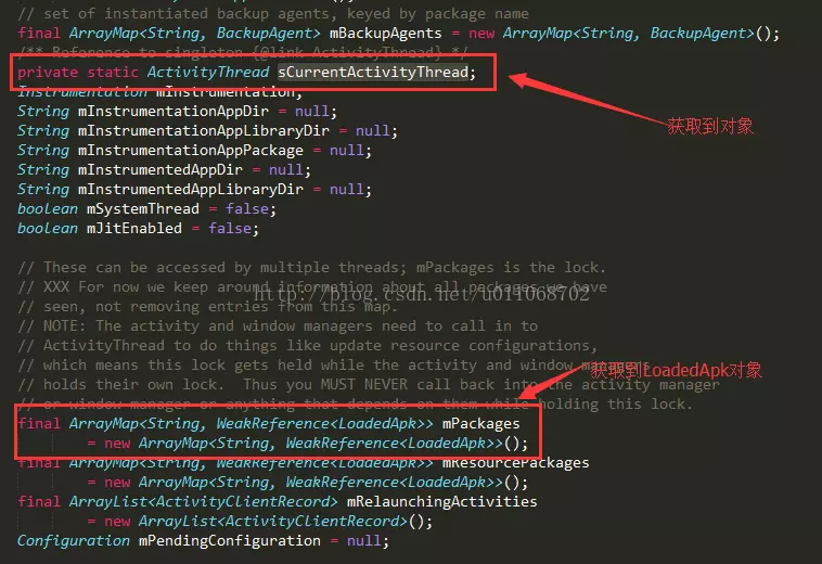 我们知道内部有个mClassLoader成员变量,我们只需要获取它就可以了,因为它不是静态的,所以我们需要先获取LoadApk这个类的对象,我们再去看看ActivityThread.java这个类。