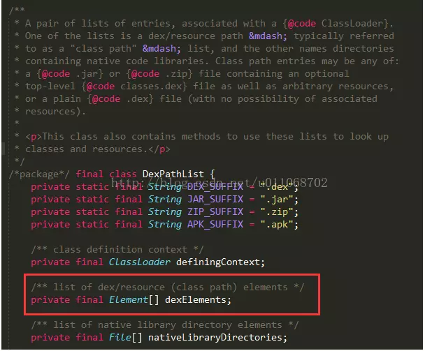 这里有一个DexPathList对象,在来看一下DexPathList.java源码: