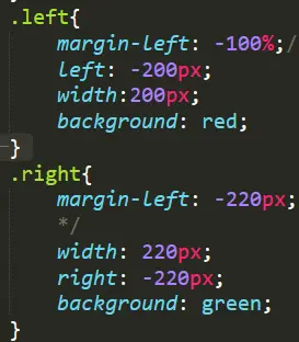 right的margin-left设置为-220pxt其含义为:在设置了left的CSS样式之后,绿色的div移动到了蓝色div的后面,所以设置绿色的div向左移动一个绿色div的宽度的长度,这样则使得绿色div位于页面的右面