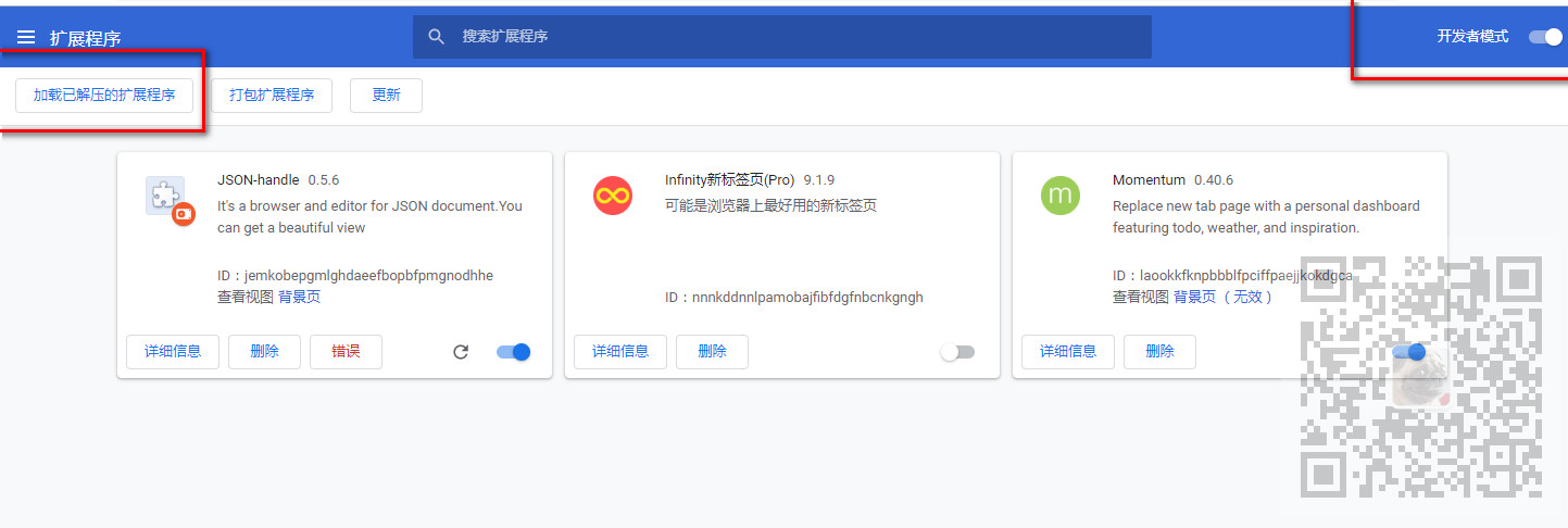 在下载JsonHandle.crx后打开Chrome浏览器的扩展程序