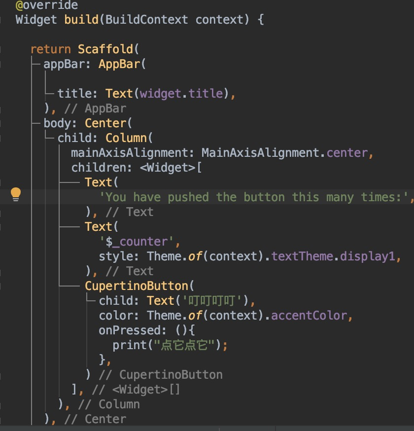}应用继承StatelessWidget,也就是应用本身就是一个Widget,Flutter里面所有的布局,视图等等都是建立在Widget上。bulid方法上面的注释我们可以看到,这是应用的个根。也就是必须需要此方法才能进行UI的搭建。