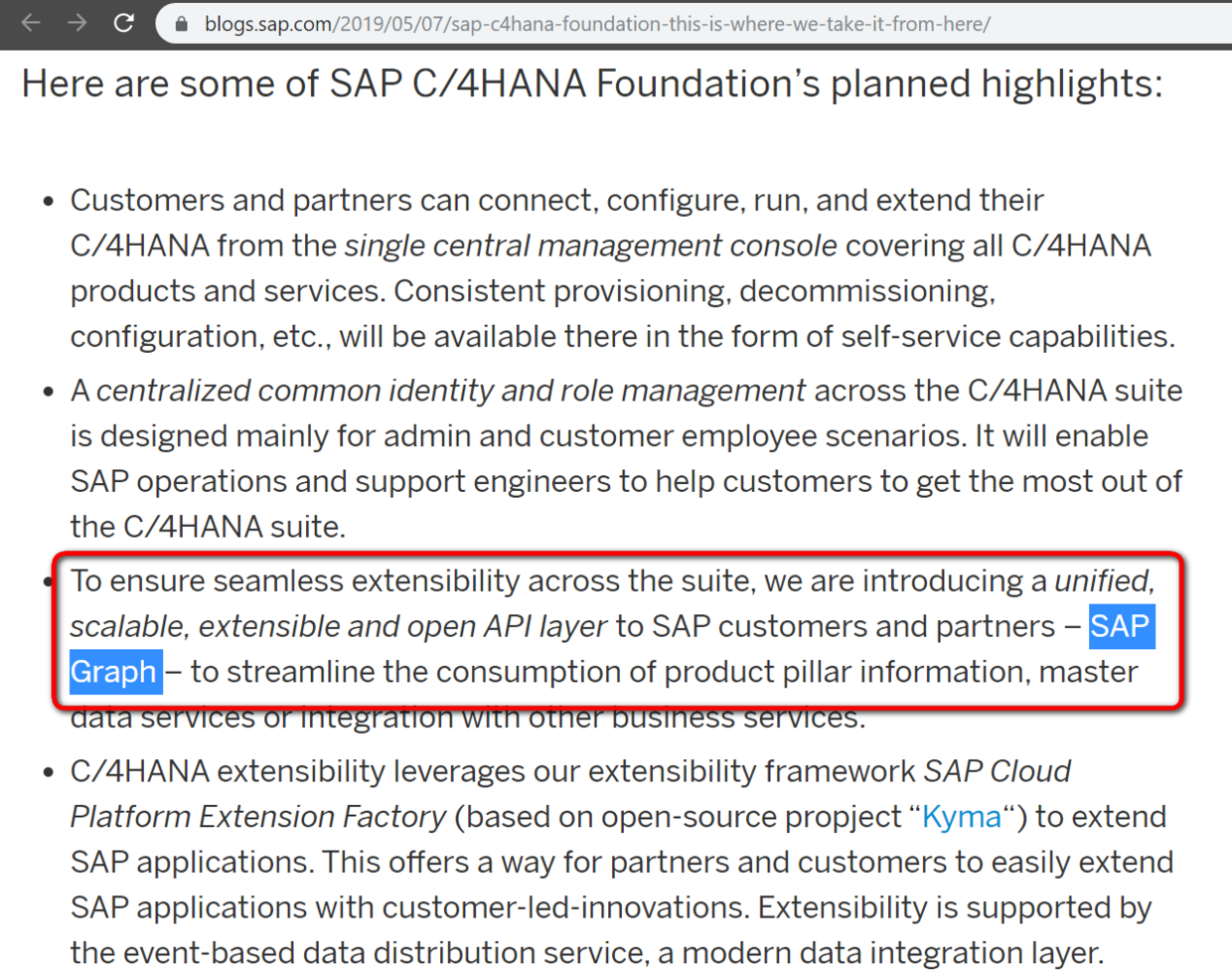 SAP Graph对于Jerry目前工作的C/4HANA生态圈更加至关重要。Thomas Hertz在他的博客SAP C/4HANA Foundation: This is where we take it from here里提到,C/4HANA foundation层将提供一个统一,可伸缩可扩展的开放API层以方便partners做扩展,即SAP Graph。