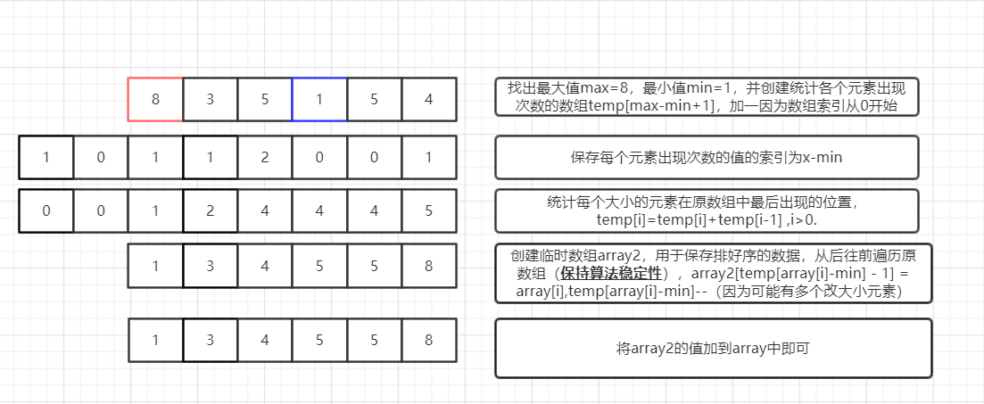 - 反向填充目标数组:将每个元素i放在新数组的第C(i)项,每放一个元素就将C(i)减去1