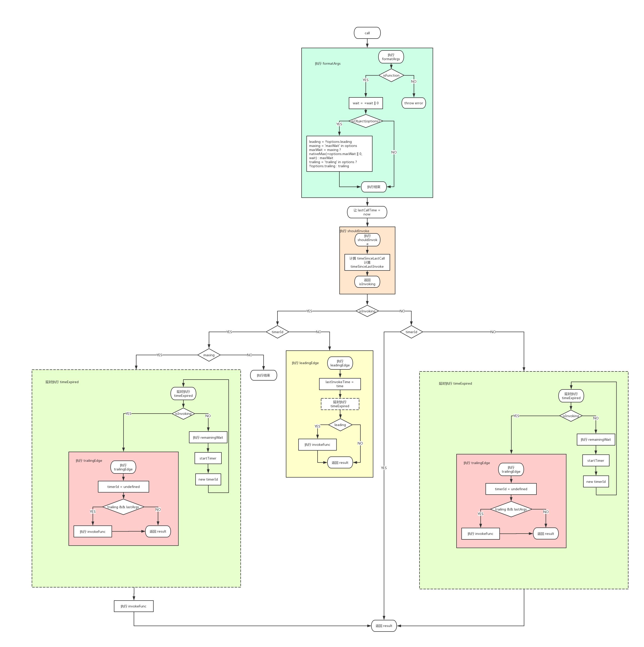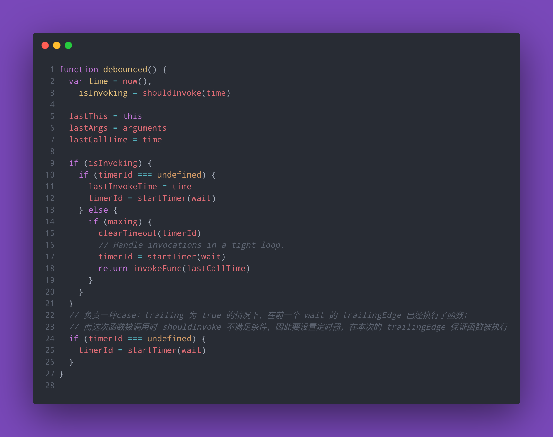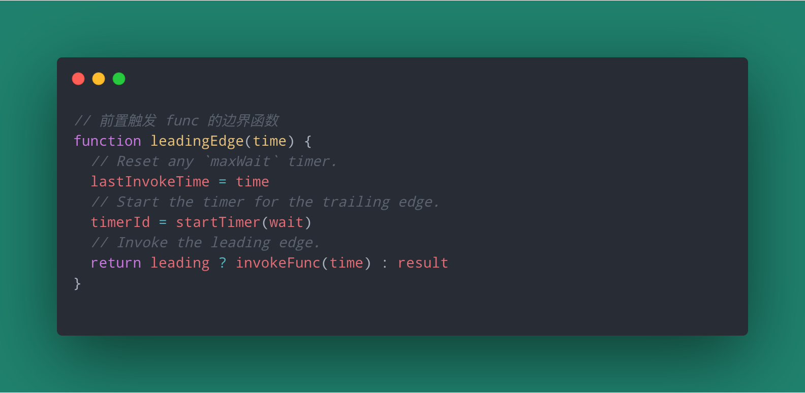 修改后的回调函数不再是单纯的调用 invokeFunc,而是先判断执行回调的时刻是否能够调用 func,如果可以,直接调用;如果不行,计算出真正的延迟时间并重置定时器。