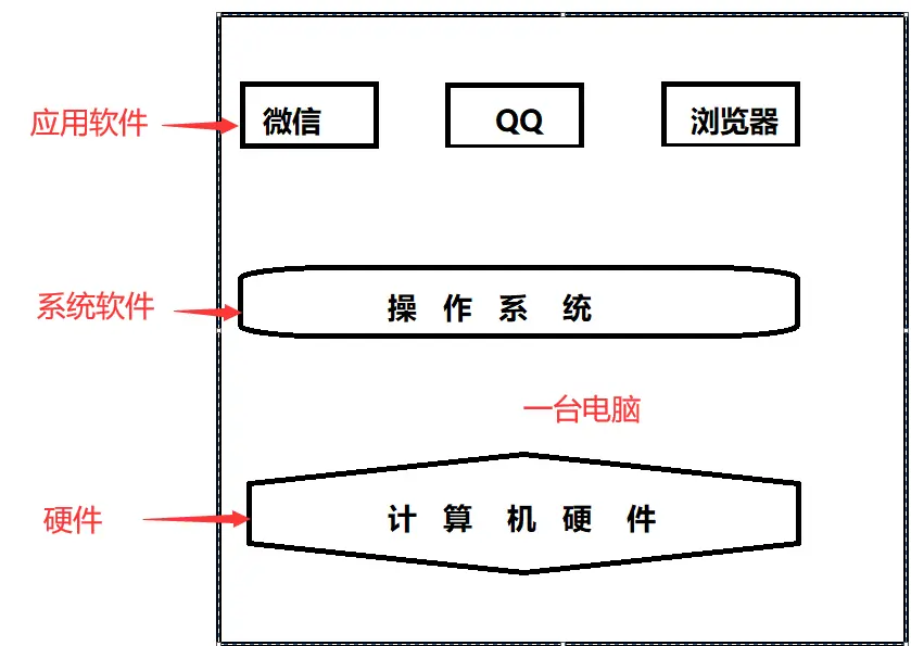 计算机知识普及 如果你已经看了刚才推荐的文章,那接下来我给你普及一下计算机基础。首先来说我们学Java、Python、C、C++等编程语言的目的是为了干什么?无非就是写代码,编写程序。比如说你学完Java、学完Python以后你就能写像暴风影音,QQ、微信、浏览器等各种各样的应用软件。好,那我们买来一台新电脑就能立马装这些软件吗?知道的朋友都会说,得先在电脑上装操作系统,比如Windows系统,等装好了操作系统然后才能装那些软件。在没装操作系统之前,你的电脑就是一堆硬件,是死的,那现在你应该明白一台完整的计算机系统应该由三层结构构成(如下图)