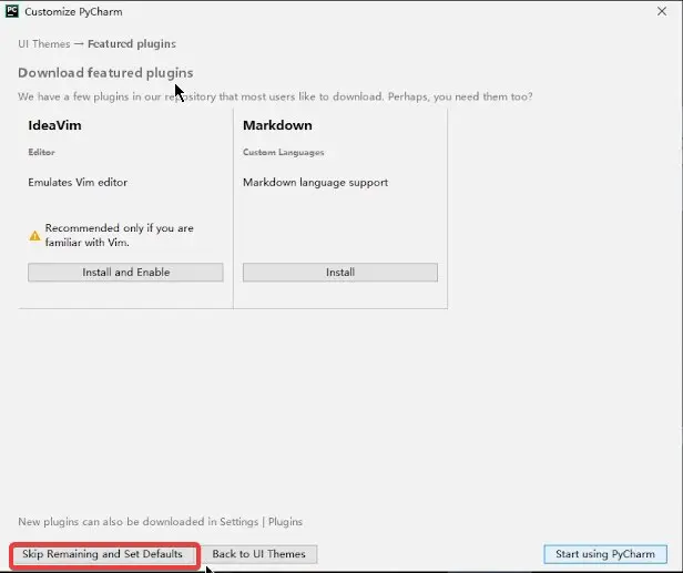 3、安装后,打开 PyCharm,选择 Do not import settings,以及 跳过,选择默认设置。