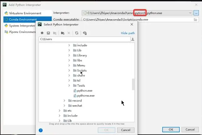 在左边选择 Conda Environment 后,在后边的 Interpreter 中,选择 路径中 \envs\pytorch 的,其中的 pytorch 就是conda 环境的名字。