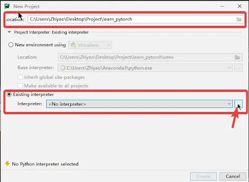 4、在 Location 中,设置项目工程地址;之后,选择下方的 Existing interpreter,点击最右边的... ,选择相应的环境。
