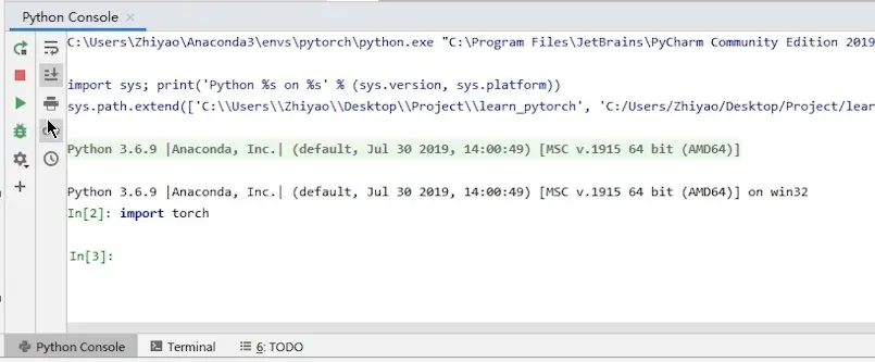 之后,可以正常打开 PyCharm,打开左下角的 Python Console,输入 import torch,如果没有出错,如下图所示。即说明 PyCharm 配置成功。