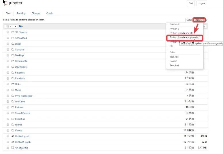 然后,点击 右上角的 New,选择下方的 Python[conda env:pytorch]。