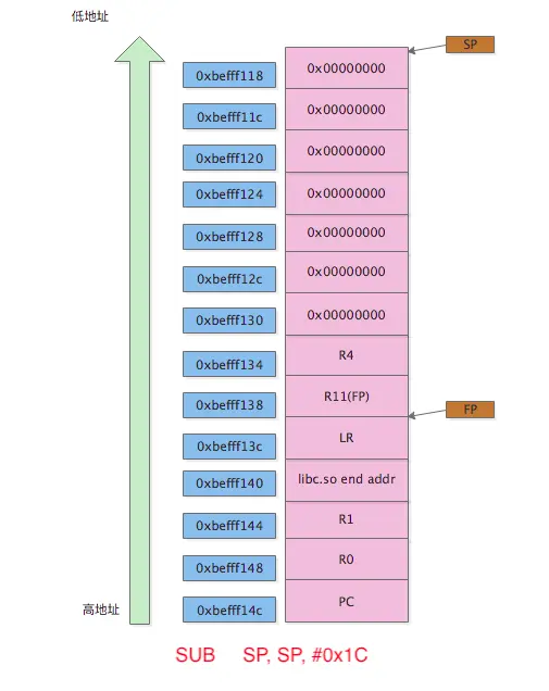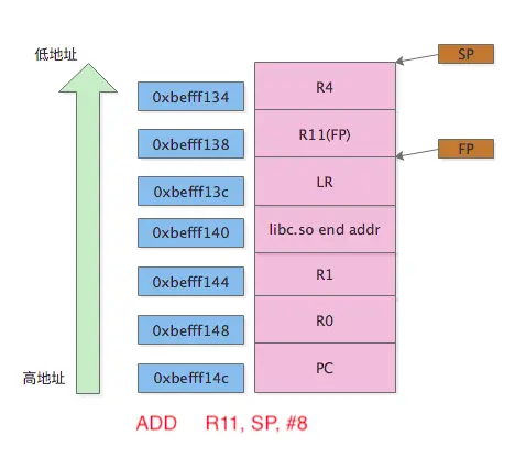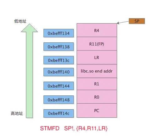 从右往左的顺序放到分配好的栈里(LR -> R11(FP) -> R4)STMFD SP!, {R4,R11,LR}堆栈情况如图