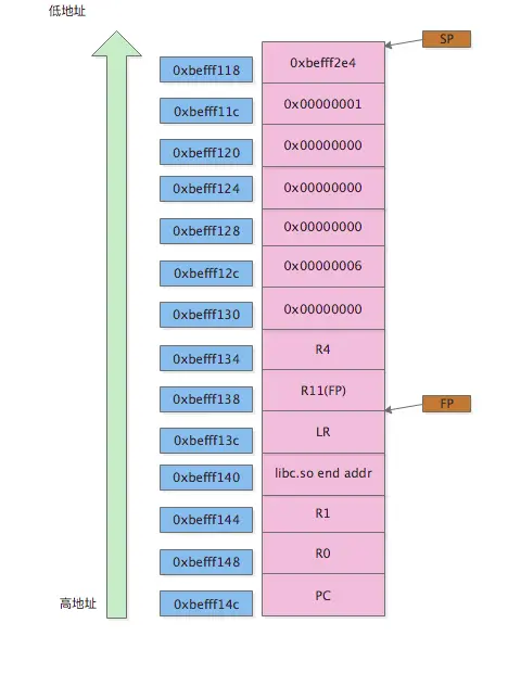r11 + (-0x24) = 0xbefff118也就是栈顶SP处STR R1, [R11,#var_24]然后分别存放0x6、0x0到0xbefff12c、0xbefff128处