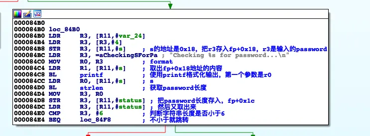 fp+0x18取出输入内容,因为刚刚调用了printfLDR R0, [R11,#s]然后调用strlen,参数是r0,获取输入内容的长度并把长度放在r3寄存器,记住r0在每个方法执行结束后就是该方法的返回值
