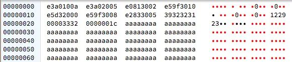 .global main ;程序入口 main: 0x00000000 MOV R1,#0xa ; E3A0100A 0x00000004 MOV R2,#5 ; E30A2005 0x00000008 ADD R3,R1,R2 ; E0813002 0x0000000c LDR R3,=pass ; E59F3008 0x00000010 LDRB R2,[R3] ; E5D32000 0x00000014 LDR R3,=pass ; E51F3000 0x00000018 ADD R3,R3,#5 ; E2833005 0x0000001c LDRB R3, [R3] ; E5D33000 .text 0x00000001c pass: .asciz "122923" ; 39323231编译后用十六进制打开差不多是这样,我这里只获取了代码和字符串部分,其他的比如格式啥的就不看了;这里字符串存储用的小端序。
