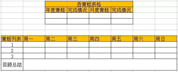 吞青蛙表格是由《吃掉那只青蛙》的作者博恩·凯西提出的。如果你每天早晨第一件事就是吃掉一只活青蛙,那么你会欣喜地发现,今天没有什么比这更糟糕的事情了(先解决最具挑战性的任务)。我们每日最难办,最具挑战性的任务就可以看成青蛙,每天优先吃掉三只“青蛙”。