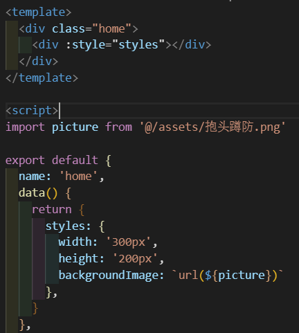<div :style="{width:'300px',height:'180px',backgroundImage:'url(../assets/抱头蹲防.png)'}"></div>