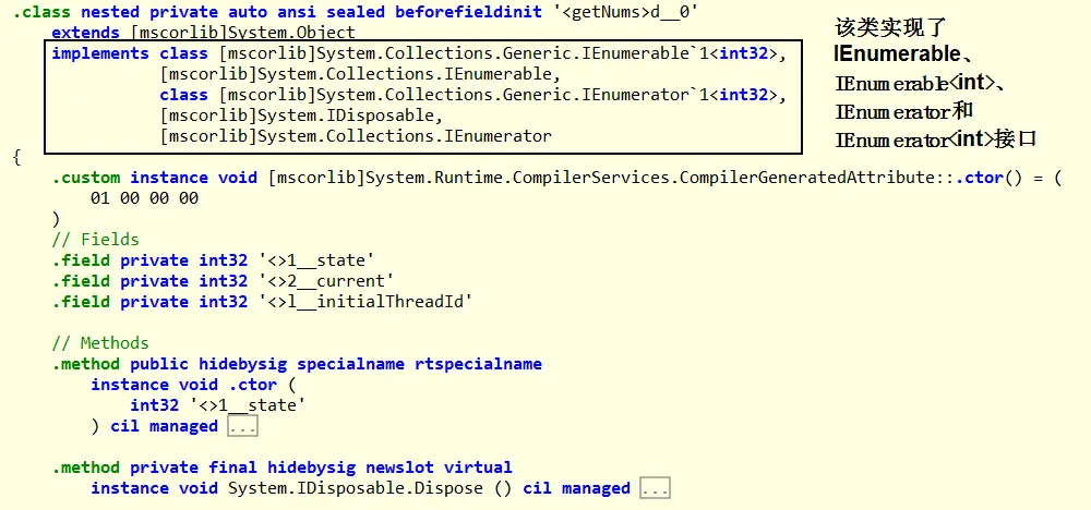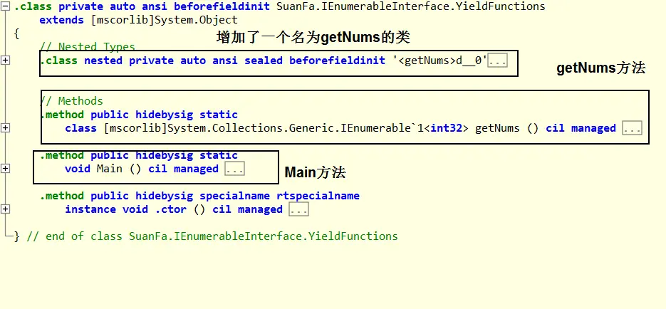 先看一下YieldFunctions类的IL代码的整体框架,主要有三部分:getNums生成的IL代码,新生成的getNums类的IL代码,Main方法的IL代码。