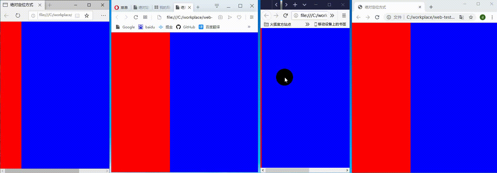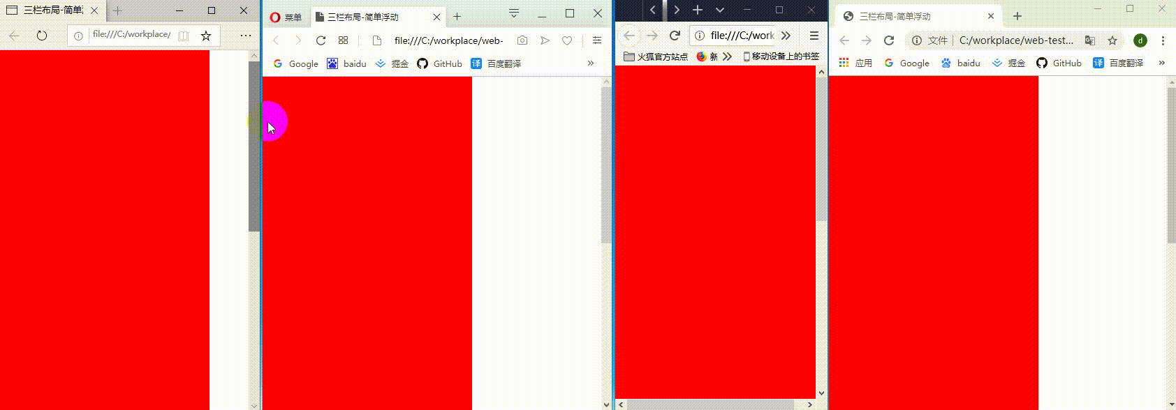1.浏览器宽度无限缩小,测试的四大浏览器中,只有opera浏览器右侧元素消失,其他浏览器排布会错乱(如图3-1)