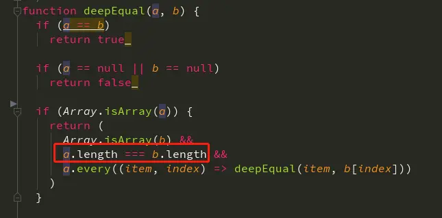 deepEqual在比较数组内元素是否相同时,提前判断两个数组的长度,在数组长度不相同时,会提前停止判断,提高比较速度。