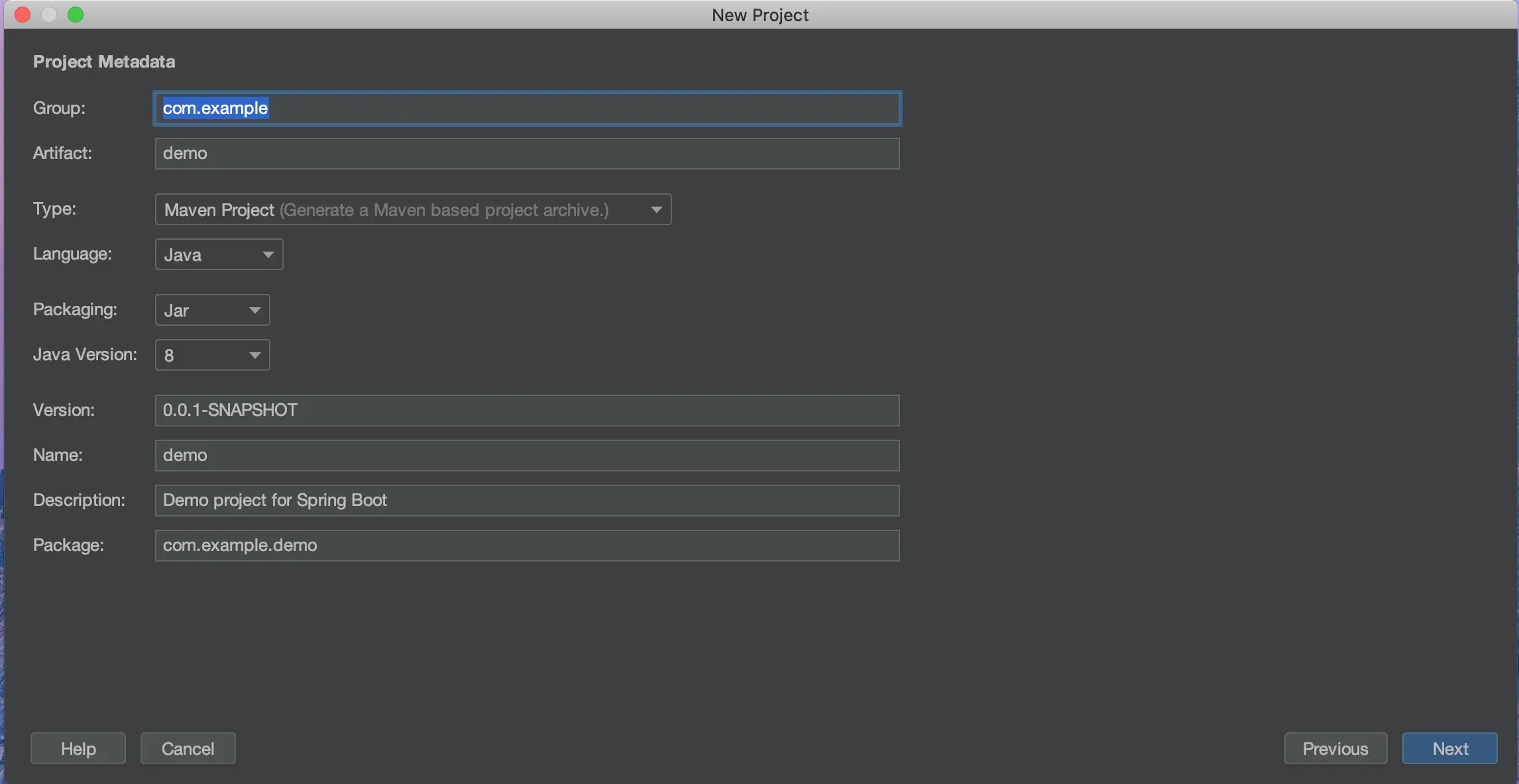 Create new project -> Spring Initializr -> Default (start.spring.io) -> Next