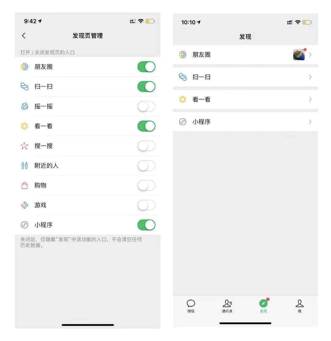 比如 微信 发现页,之前是全部展示的,但是在 微信6.6.2 版本中增加了对 发现页的管理 设置。极大地减少了用户查找信息的时间。