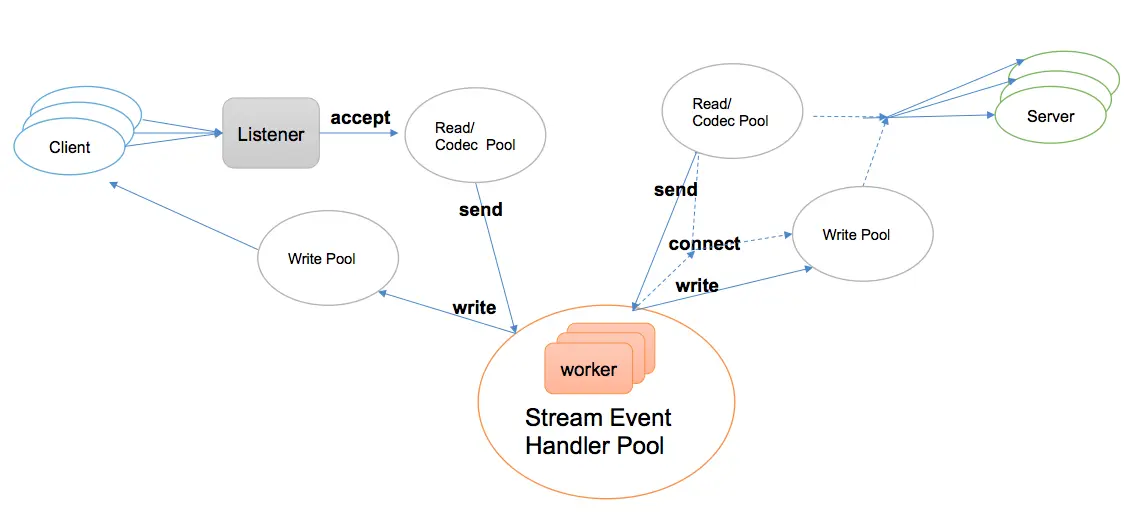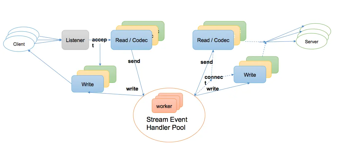 如下图所示,使用 GoLang 默认的 epoll 机制,对每个连接分配独立的读写协程进行阻塞读写操作,proxy 层做转发时,使用常驻 worker 协程池负责处理 Stream Event