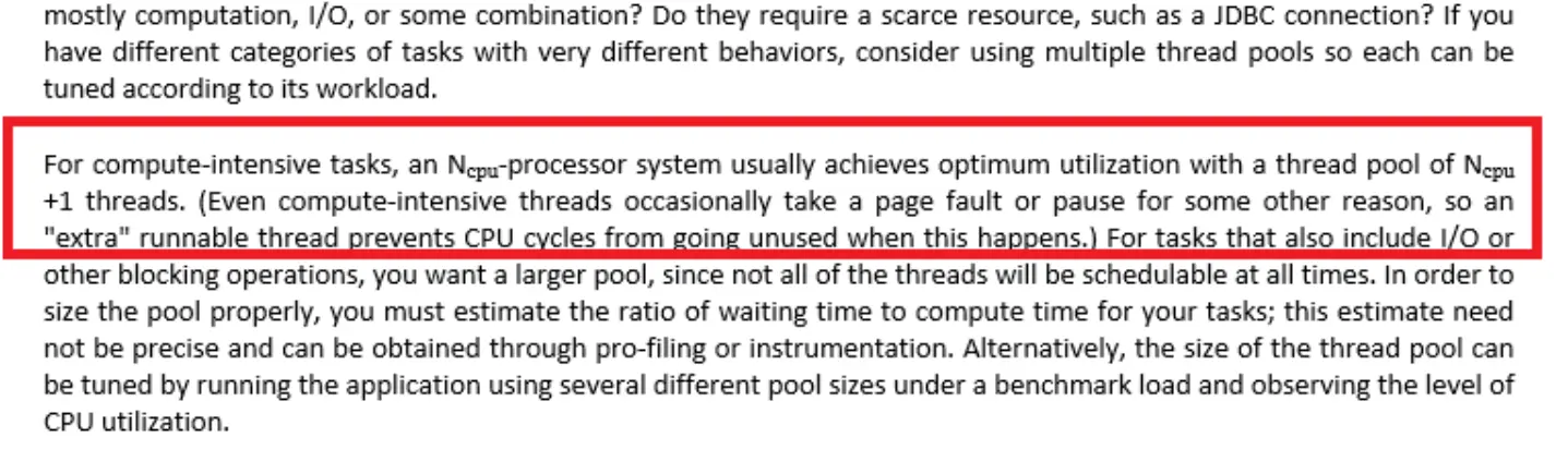 即对于计算密集型的任务,在拥有N个处理器的系统上,当线程池的大小为N+1时,通常能实现最优的效率。(即使当计算密集型的线程偶尔由于缺失故障或者其他原因而暂停时,这个额外的线程也能确保CPU的时钟周期不会被浪费。)