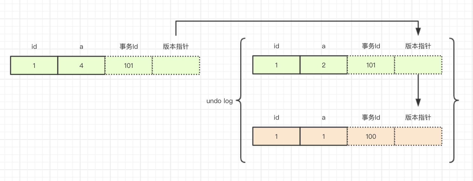 假设由Insert事务提交产生一条原始记录a,事务101连续更新两次a值,但未提交,这时事务102要查询a值,在事务开始时生成ReadView,记录当前活动事务[101],查找a=4的记录发现事务id为101,位于ReadView中,于是顺着版本链,找到第一条事务id不在ReadView中的a=1,返回