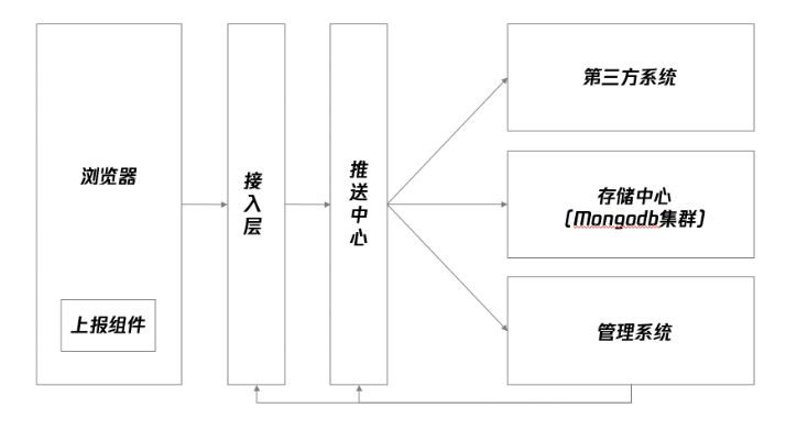 图为腾讯BetterJS的架构图,其中“接入层”和“推送中心”就是这里提到的接入层和消息队列。BetterJS将整个前端监控的各个模块进行拆分,推送中心承担了将日志推送到存储中心进行存储和推送给其他系统(例如告警系统)的角色,但我们可以把接收日志阶段的队列独立出来看,在接入层和存储层之间做一个过渡。