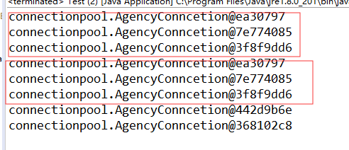 结果分析:连接池中定义最大的连接数是5,初始化连接数是3,前三个连接调用的是close()方法是将连接回收,放回list集合中。所以后面五个连接对应的五个地址中一定有三个与前三个连接相同。 结果如下: