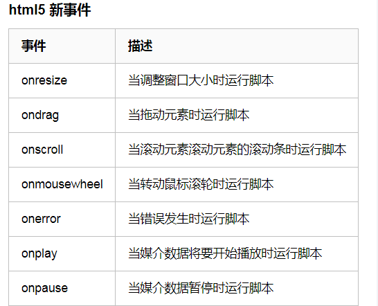 onresize(当屏幕尺寸发生改变的时候)、ondrag(拖拽)、onscroll(在元素滚动条在滚动时触发)、onmousewheel(滚轮滚动)、onerror(资源加载失败)、onplay(开始播放)、onpause(暂停播放)