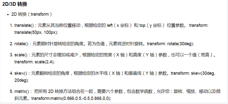 translate():元素从其当前位置移动,根据给定的 left(x 坐标) 和 top(y 坐标) 位置参数。 +transform: translate(50px, 100px);rotate():元素顺时针旋转给定的角度。若为负值,元素将逆时针旋转。transform: rotate(30deg);- scale()·:元素的尺寸会增加或减少,根据给定的宽度(X 轴)和高度(Y 轴)参数,也可以一个值(宽高)。transform: scale(2,4);