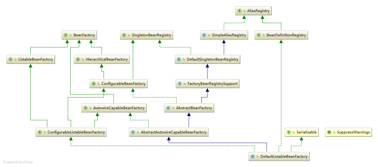 - BeanFactory:IOC容器最顶层的接口,对IOC容器的基本行为做了定义,很明显这就是工厂模式的工厂接口