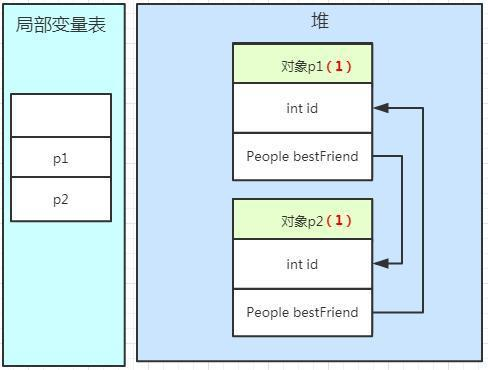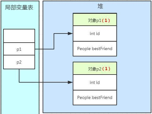 实现思路:给对象添加一个引用计数器,每当有一个地方引用它,计数器加1。当引用失效,计数器值减1。任何时刻计数器值为0,则认为对象是不再被使用的。举个小栗子,我们有一个People的类,People类有id和bestFriend的属性。我们用People类来造两个小人: