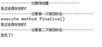 finalize()方法是被第一次标记对象的逃脱死亡的最后一次机会。在jvm中,一个对象的finalize()方法只会被系统调用一次,经过finalize()方法逃脱死亡的对象,第二次不会再调用。由于该方法是在对象进行回收的时候调用,所以可以在该方法中实现资源关闭的操作。但是,由于该方法执行的时间是不确定的,甚至,在java程序不正常退出的情况下该方法都不一定会执行!所以在正常情况下,尽量避免使用!如果需要"释放资源",可以定义显式的终止方法,并在"try-catch-finally"的finally{}块中保证及时调用,如File相关类的close()方法。下面我们看一个在finalize中逃脱死亡的栗子吧: