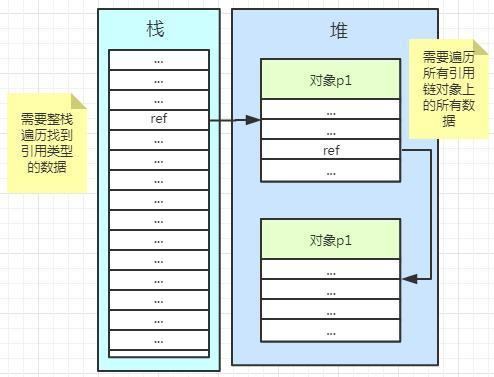 如果是进行根节点枚举,我们先要全栈扫描,找到变量表中存放为reference类型的变量,然后找到堆中对应的对象,最后遍历对象的数据(如属性等),找到对象数据中存放为指向其他reference的对象……这样的开销无疑是非常大的!
