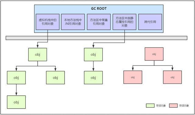 实现思路:通过GC Roots的对象作为起始点,从这些节点向下搜索,搜索走过的路径成为引用链,当一个对象到GC Root没有任何引用链相连时,则证明对象是不可用的。如下图,红色的几个对象由于没有跟GC Root没有任何引用链相连,所以会进行标记。