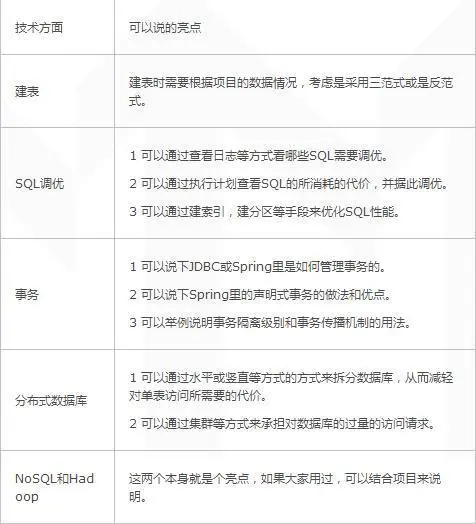 在下表里,我们列了些在数据库方面可以准备的亮点。