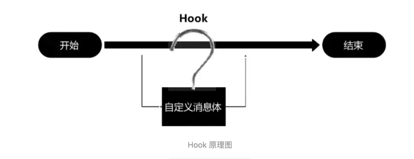 Hook单词的意思就是钩子,那我们在什么时候用到这个钩子呢,如上图所示,在一个事件或者动作执行的过程中,截获相关事件或者动作,加入自己的代码或者替换装自己的代理对象,这就叫Hook