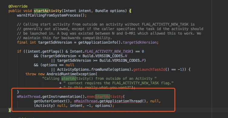 这个例子我们在context.startActivity的调用链,找到相关的hook点进行替换。我们首先分下context.startActivity的流程,Context.startActivity其实走到了ContextImpl的startActivity