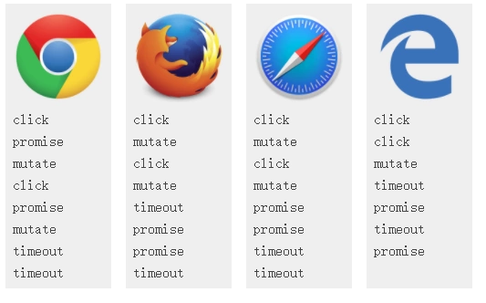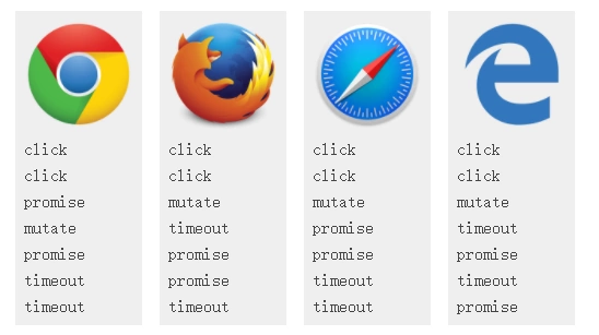 Firefox和Safari在click监听器回调之间正确执行了mutation 回调的微任务,但promise打印结果却出现在了错误的位置。 无可厚非的是jobs和微任务的关系太含糊不清,不过我仍认为应该在click监听器回调之间执行。 Edge我们早就知道会把promise回调放进错误的队列,但他也也没在click监听器回调之间执行微任务队列,而是在所有监听器回调后执行,这打印click之后只打印了一次muteta,为此我给它提了个bug。